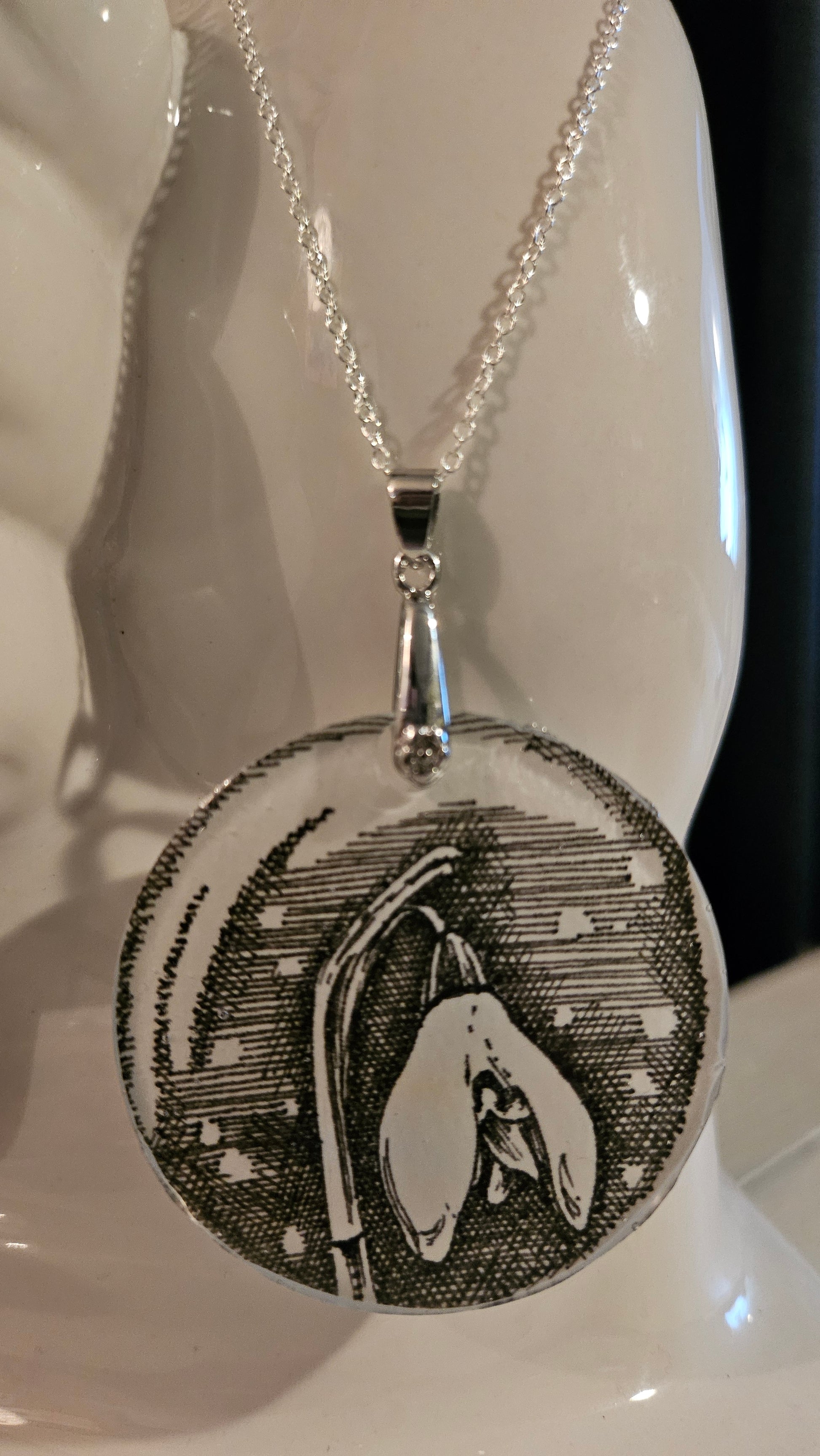 Original pen and ink drawing encapsulated in resin, made into a pendant and hung on a 20-inch silver chain necklace. Wearable art to start or add to your art collection! Snowdrop flowers bloom in late winter, and signal that spring is coming. As such, they represent new beginnings, hope, and ability to overcome obstacles.