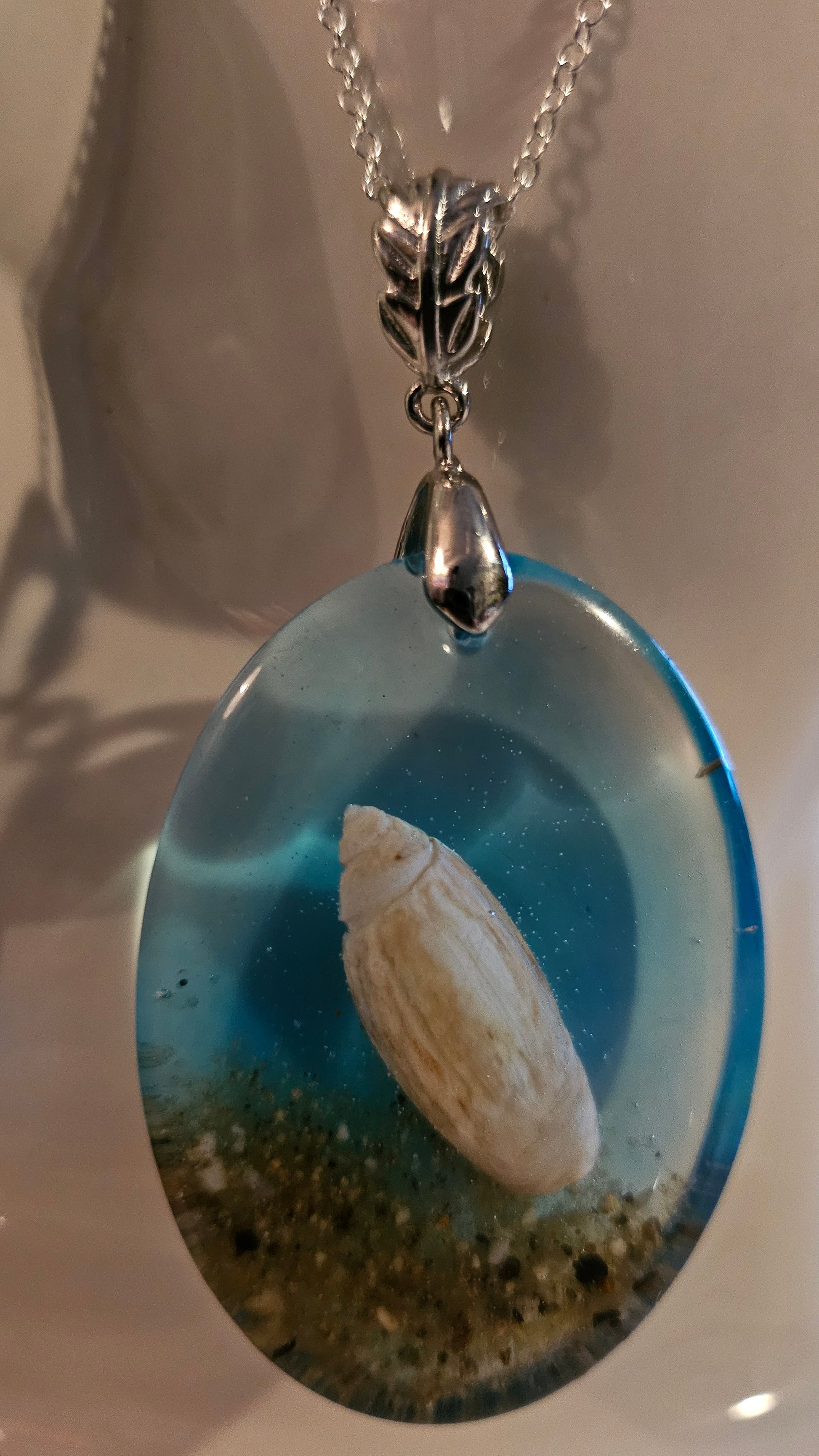Handmade pendant with resin, sand and a sweet, tiny seashell. Great gift for your loved one (or yourself)! One-of-a-kind, unique, wearable piece on 20-inch silver chain with lobster clasp.