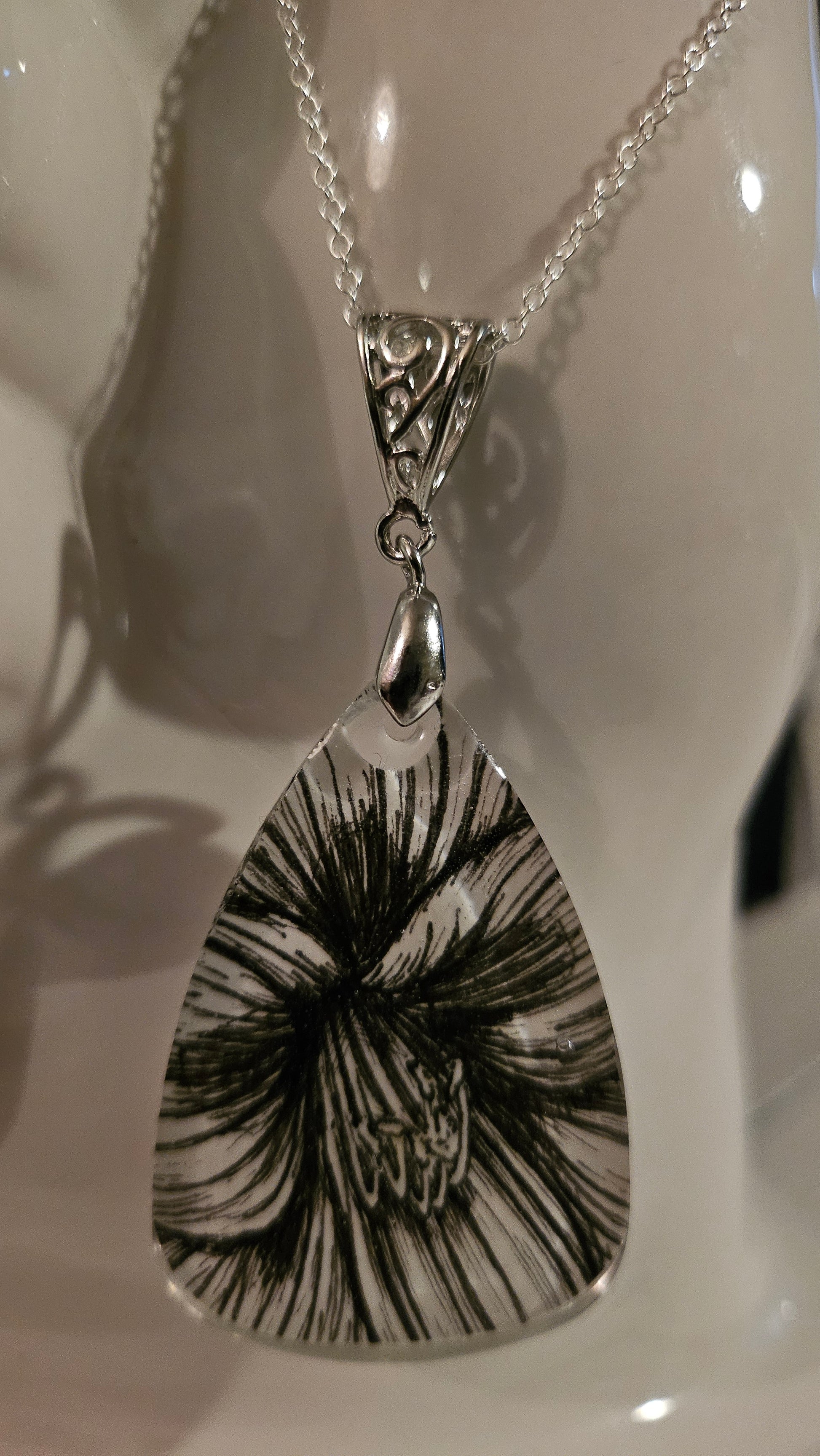 Original pen and ink drawing encapsulated in resin, made into a pendant and hung on a 20-inch silver chain necklace. Amaryllis represents pride, strength, and determination because they stand taller than all other winter blooms. Wearable art to start or add to your art collection!