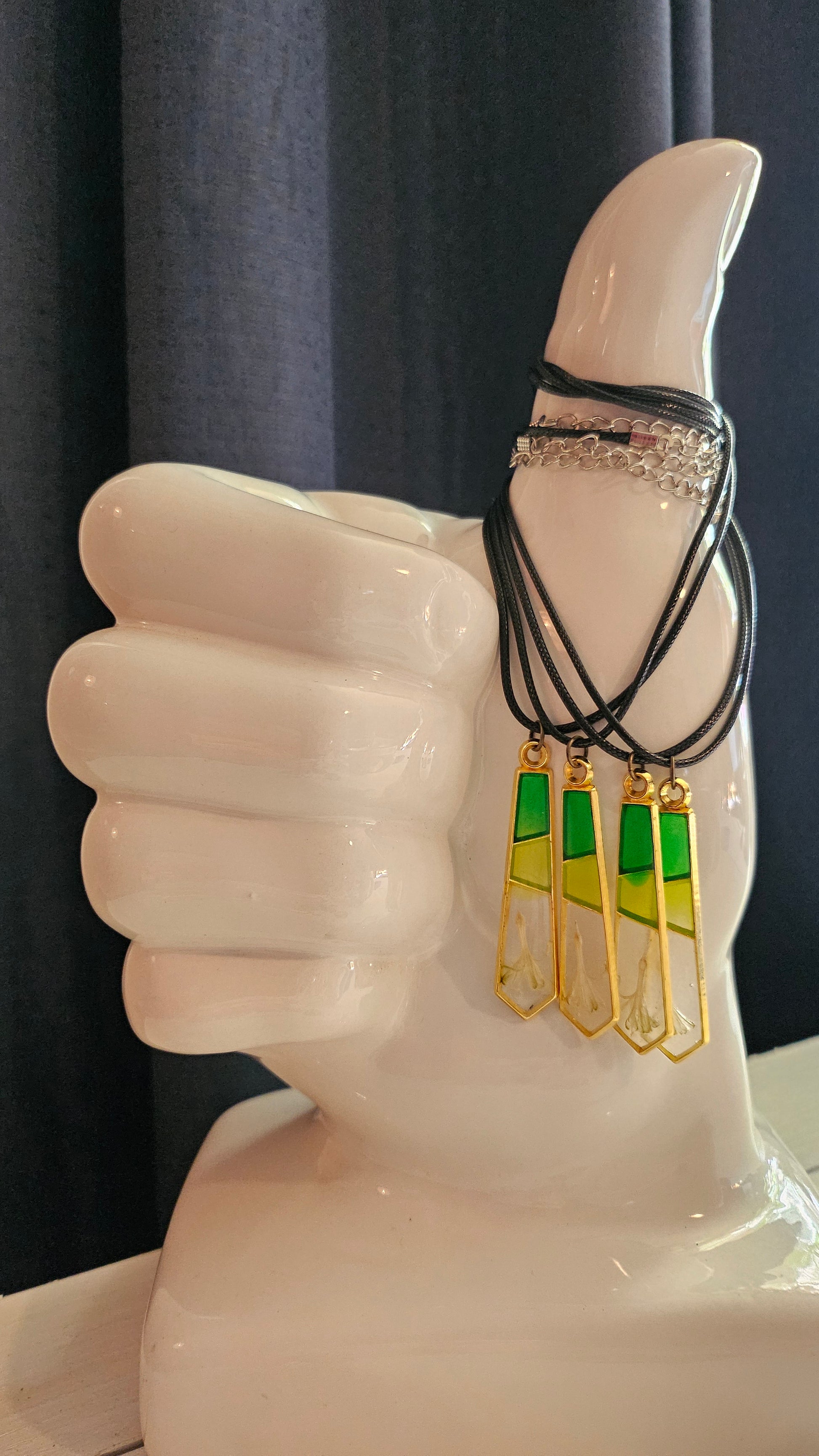 Spotted Dracaena symolizes good fortune and happiness. A single flower harvested from my own plant is suspended in resin with a gold (colored) gem-shaped frame. Hung on an adjustable 18-inch black leather cord to make it wearable!